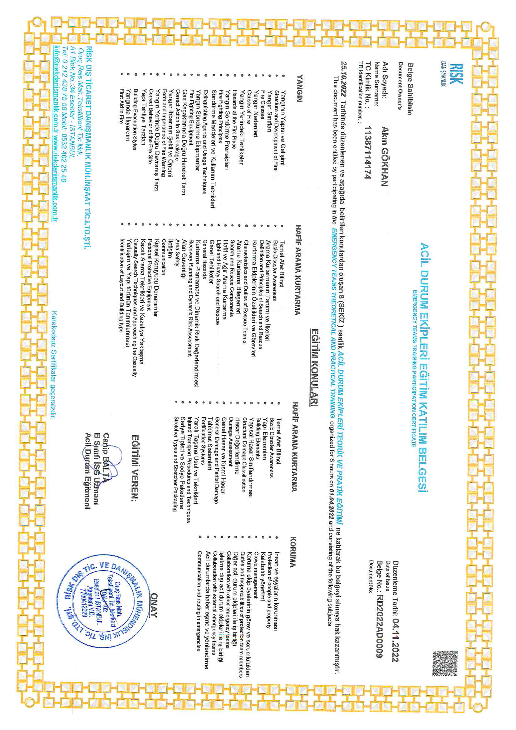25.10.2022 Tarihinde düzenlenen8 (SEKİZ ) saatlik ACİL DURUM EKİPLERİ TEORİK VE PRATİK EĞİTİMİ ne katılarak bu belgeyi almaya hak kazanmıştır.